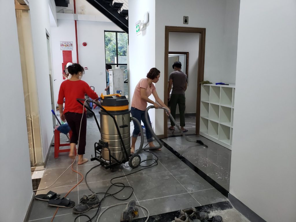 - Tiến hành vệ sinh: Sử dụng các thiết bị hiện đại và hóa chất an toàn để làm sạch từng khu vực.
